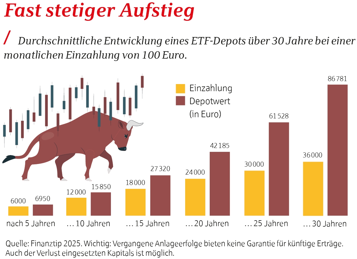 Investmentsparpläne sind je nach Anbieter schon ab 1 oder 10 Euro pro Monat möglich. Sie lassen sich über die Jahre flexibel und kostenlos an die eigenen finanziellen Möglichkeiten anpassen. Wichtig: Mindestens 10, besser 15 Jahre oder länger sollte man Zeit fürs ETF-Sparen haben, damit sich zwischenzeitliche Börsenschwankungen wieder ausgleichen lassen. „Wer erste positive Erfahrungen sammelt und sieht, wie regelmäßiges Sparen in chancenreichen Anlagen auch in einem schwankenden Kapitalmarkt langfristig eine solide Basis schaffen kann, wird motiviert, seine Vorsorge weiter auszubauen“, sagt Gaugenrieder.